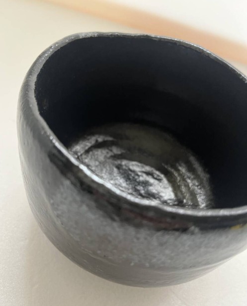 A whole surface of 黒楽【KURO-RAKU】 tea bowl is entirely covered by beautiful, smooth, soft, and shiny black glaze looks like 漆器【SHIKKI】or 漆【URUSHI(JAPAN lacquer wears)】. That matches bright yellow green of 抹茶【MATCHA】so much.